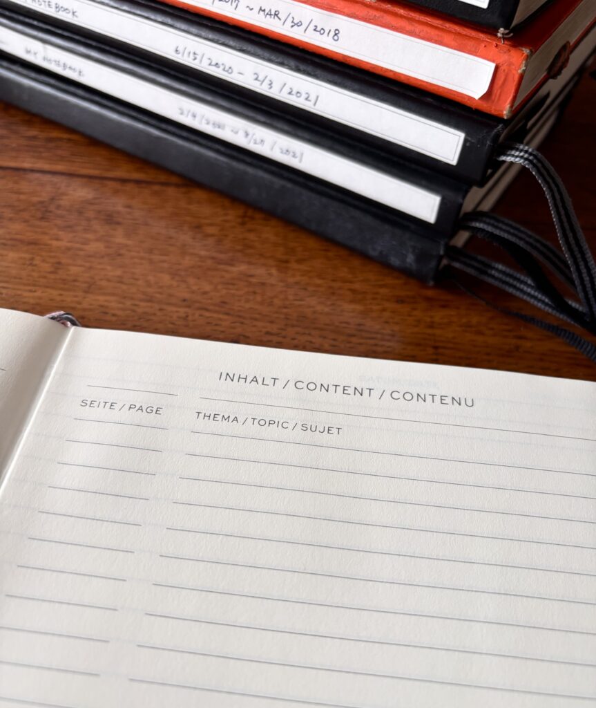 最初にロイヒトトゥルム1917を使ったときに、一番感動したのが各ページにページ番号(ノンブル)が印刷されていたこと。予めノンブルが振られているので、スムーズに目次にページを記入できます。ロイヒトトゥルム1917以外のノートを使うときは、ノンブルも目次ページもないことが多く、自分でノンブルを振って目次ページをつくって対応しています。
