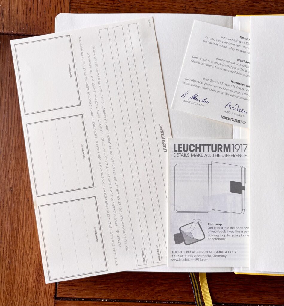 ノートにチケットやメモなどを挟んで保管したいことがよくあります。ロイヒトトゥルム1917は、最後の見返しにマチ付きポケットが標準装備されていて、ロイヒトトゥルム1917を紹介している小さなカードが入っています。このポケットが便利で、ちょっとしたメモや予備の名刺を入れておくことができます。