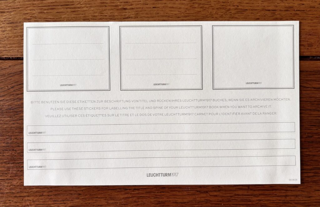 表紙と背表紙に貼るためのラベルステッカーが付属しています。ノートを使い終わったら、ラベルにタイトルや使用期間を記入して貼っておくと、後で探すときにインデックスとして便利です。