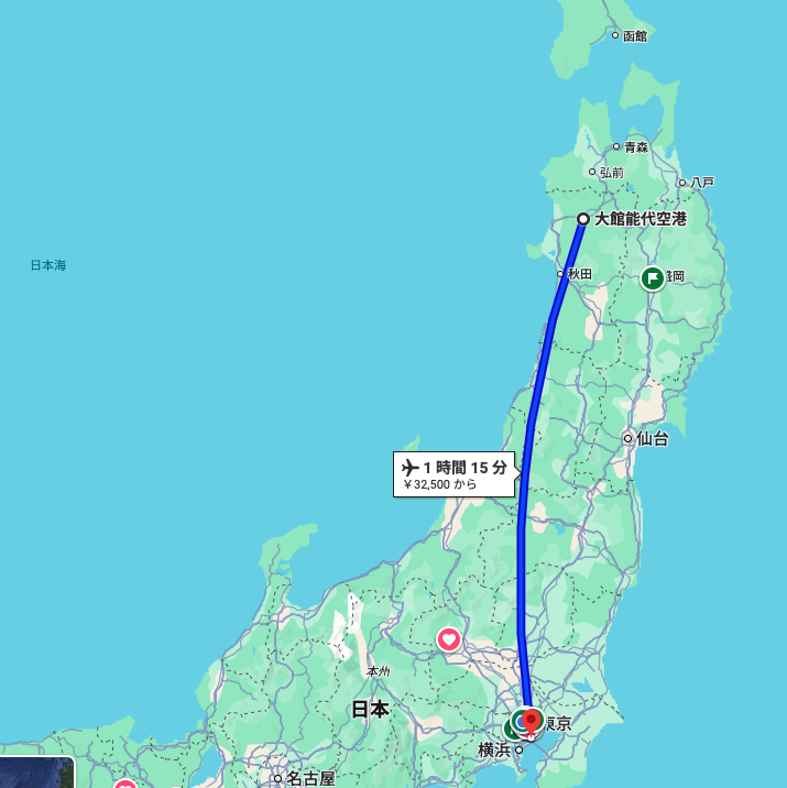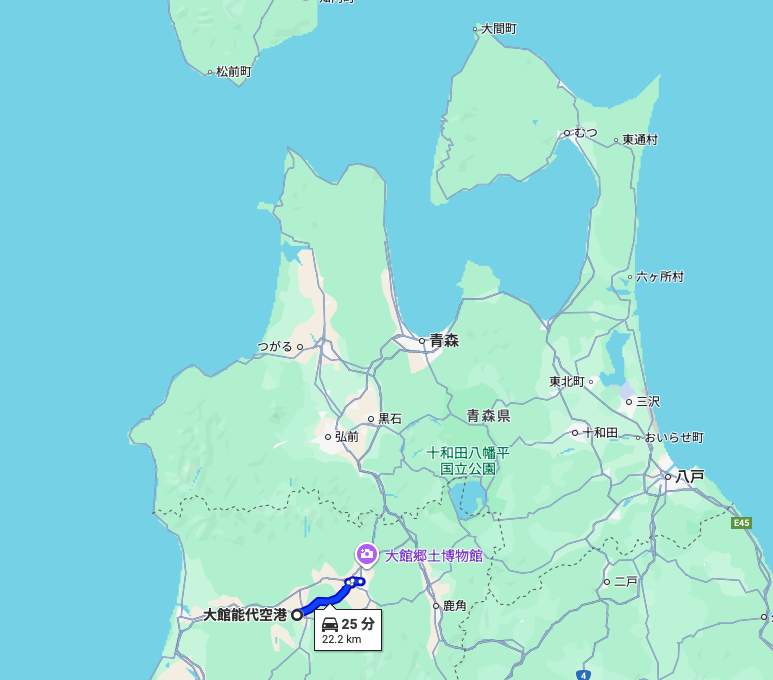青森に行くなら、ふつうは青森空港から行くことが多いと思いますが、周辺の町にも寄り道をしたかったので、大館能代空港を選びました。大館能代空港から青森へは、高速道路で1時間半ほどの距離。途中に大館市、弘前市などがあるので、ちょこちょこで寄り道できました。